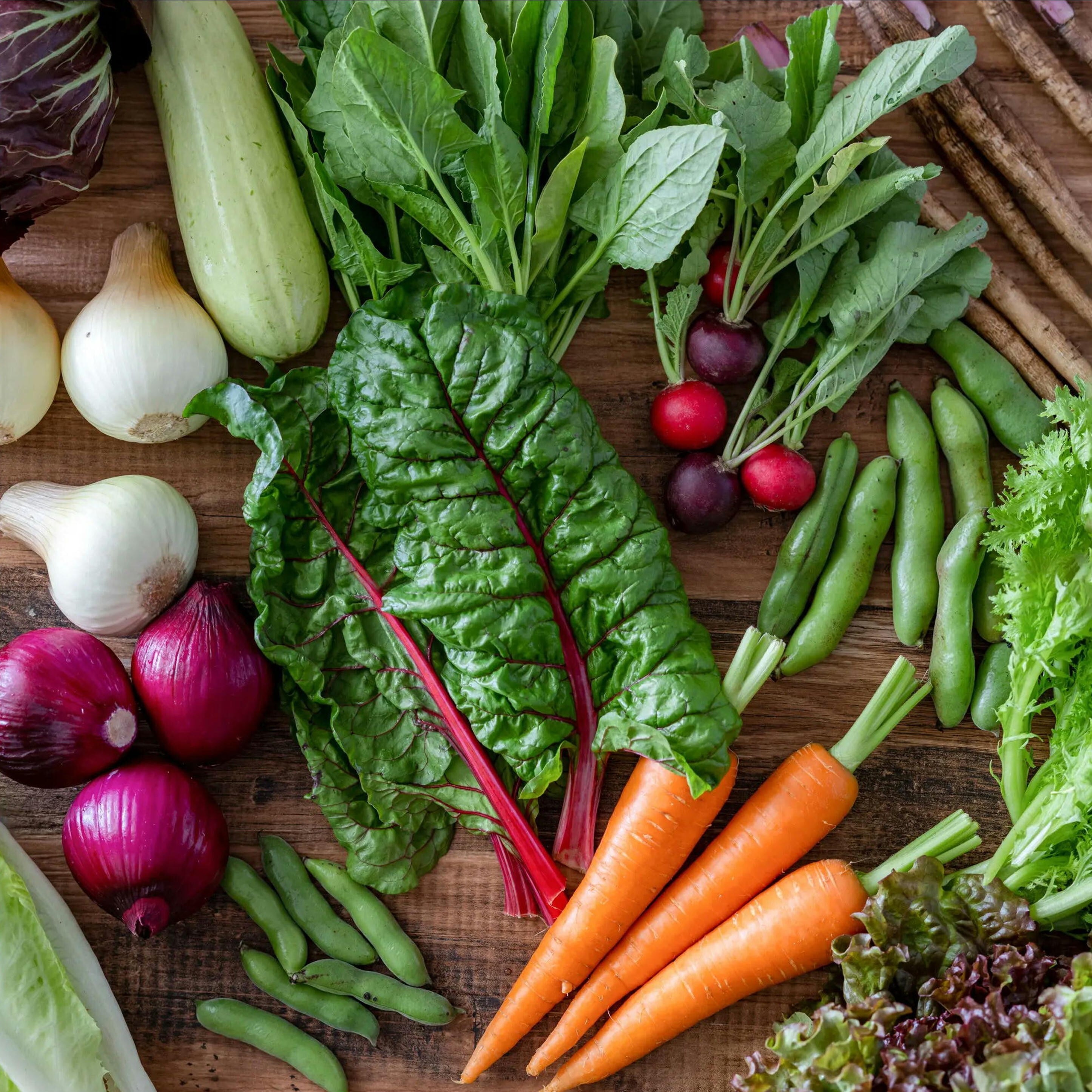 丁寧に育てた年間300品種以上の露地栽培野菜の中から、彩り豊かな季節の旬野菜15種類をお届けします。